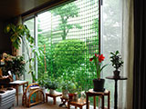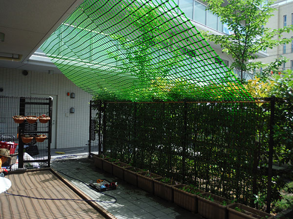 お部屋の中から見た緑のカーテン。植物が成長する前も日差しを遮る素材です。★有料老人ホーム 幅4.5m×高さ6m ご予算70,000円